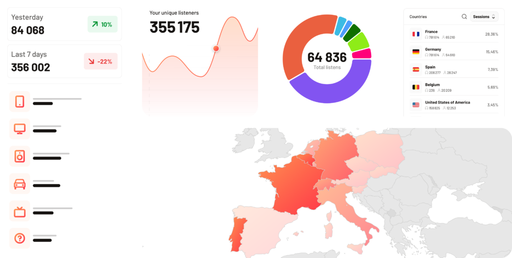 Visualize every minute of listening: what your listeners are tuning into, when, and from where, and discover the sources of your listens. Our solution offers precise listener location (city, region) to refine your strategic choices.